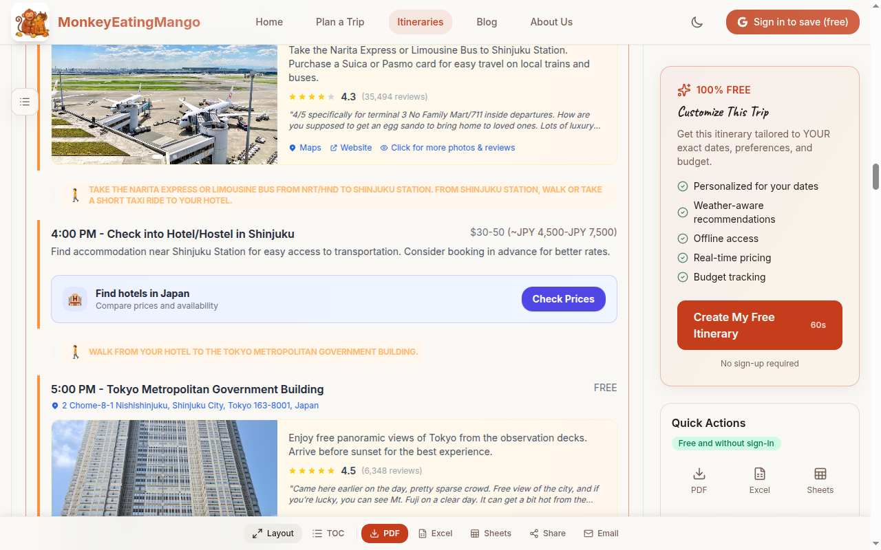 MonkeyEatingMango offers PDF, Excel, and Google Sheets export at no cost, with no account required. Wanderlog locks PDF export behind its $40/year Pro subscription. If you just want a printable itinerary to carry on your trip, this is a meaningful difference.