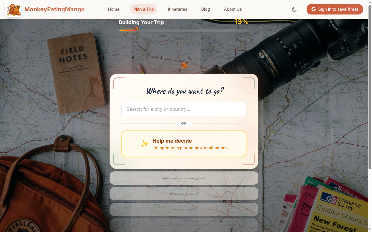 MonkeyEatingMango is a plan generator. You answer 8 questions about your destination, dates, budget, interests, and travel style. The AI generates a complete itinerary with activities, restaurants, estimated costs, commute times, and hotel suggestions. You get a finished starting point that you can export and customize.